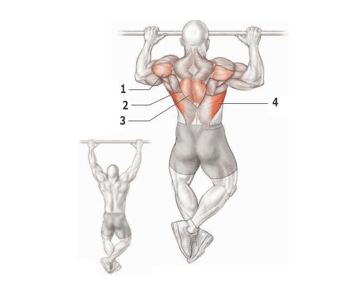 Очень много силовых упражнений в большей или меньшей степени задействуют «крылья». Но только одно упражнение является прицельным и полностью естественным к биомеханике тела. И это подтягивания. При любом хвате они создают направление нагрузки идентичное направлению естественному сокращения широчайших мышц спины. Во время подтягивания локти приближаются к торсу и заводятся за спину, отлично прорабатывая широчайшие мышцы спины.